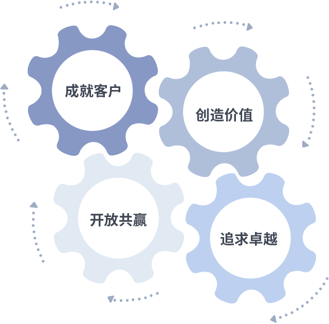 成就客户是一切决策的出发点,,创造价值是衡量所有工作的标准,,追求卓越是我们做事做人的态度,,,,开放共赢是我们的格局也是最终的结果。。。。价值观的齿轮环环相扣,,,,推动着组织里的每个人不断向前。。。
